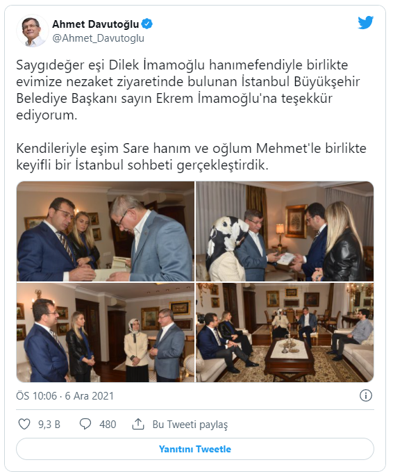 "Saygıdeğer eşi Dilek İmamoğlu hanımefendiyle birlikte evimize nezaket ziyaretinde bulunan İstanbul Büyükşehir Belediye Başkanı sayın Ekrem İmamoğlu'na teşekkür ediyorum. Kendileriyle eşim Sare hanım ve oğlum Mehmet'le birlikte keyifli bir İstanbul sohbeti gerçekleştirdik."