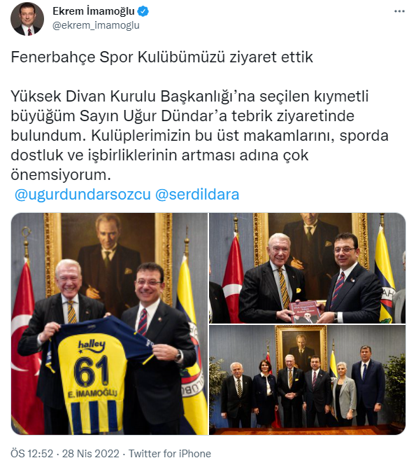 "İBB Başkanı Sn. Ekrem İmamoğlu sporla ilgili sosyal medya paylaşımlarınız Fenerbahçe'ye gönül veren ve sizi takdir eden milyonları üzüyor. Taraftarımızın gönlünü alacak jestler beklediğimizi sizin gibi önü açık, değerli bir siyasetçiye hatırlatmak isterim"