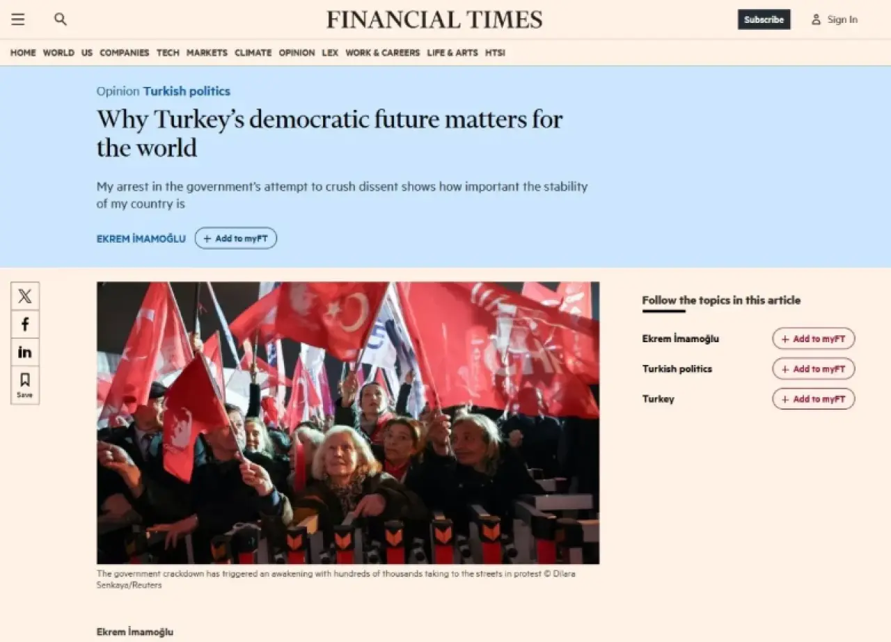 İstanbul Büyükşehir Belediye Başkanı (İBB) ve CHP'nin cumhurbaşkanı adayı Ekrem İmamoğlu, tutuklu bulunduğu Silivri Cezaevi'nden Financial Times’a yazdığı yazısında, Türkiye’deki siyasi ortamın küresel demokrasi krizine etkilerini vurguladı. İmamoğlu, Erdoğan’ın kendisini parmaklıklar ardına koymasının zafer değil, “bir uyanışı tetiklediğini” belirtti.
