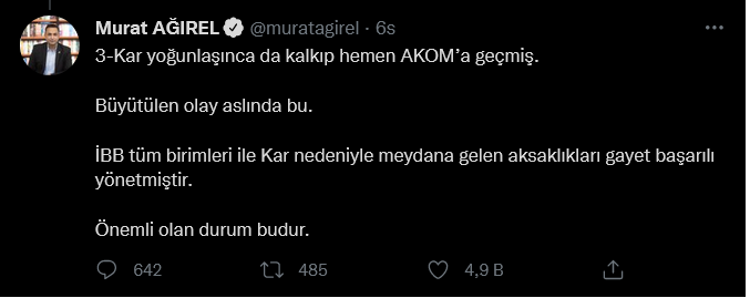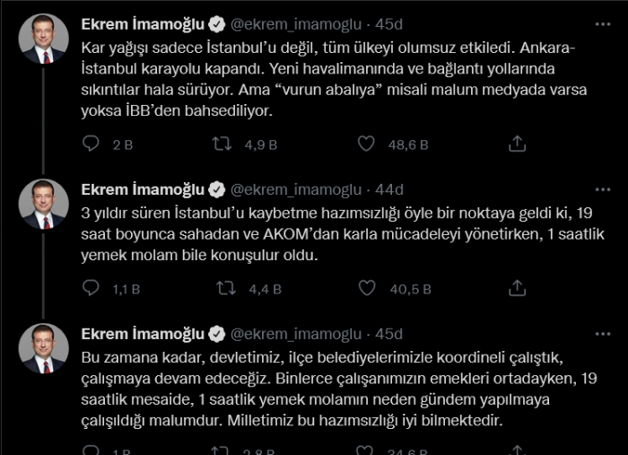 3 yıldır süren İstanbul’u kaybetme hazımsızlığı öyle bir noktaya geldi ki, 19 saat boyunca sahadan ve AKOM’dan karla mücadeleyi yönetirken, 1 saatlik yemek molam bile konuşulur oldu.