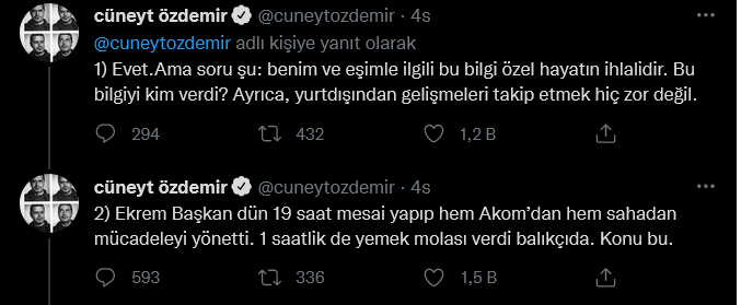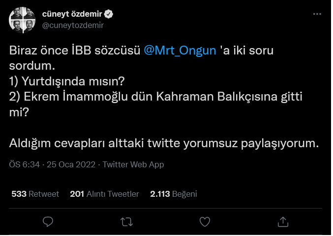 Yaşanan bu hadiseler silsilesinden sonra da İBB Sözcüsü Murat Ongun'un dün yurtdışında olduğunu iddia edildi. Gazeteci Cüneyt Özdemir, Ongun'a ulaşarak iddiaları sordu. Özdemir, bugün yaptığı youtube yayınında ve Twitter hesabından Ongun'un cevabuını paylaştı. Cevap ise şöyle:
