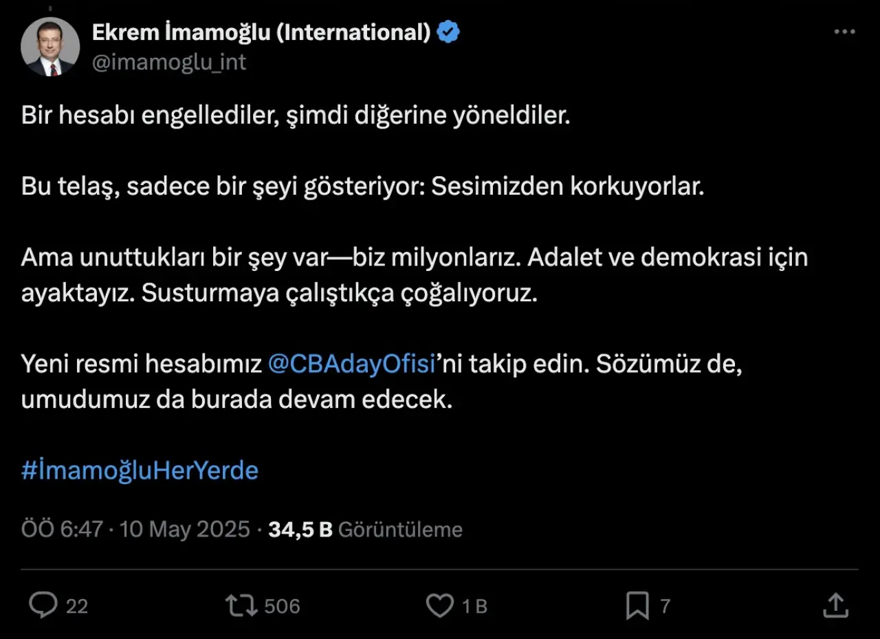 "Bir hesabı engellediler, şimdi diğerine yöneldiler. Bu telaş, sadece bir şeyi gösteriyor: Sesimizden korkuyorlar. Ama unuttukları bir şey var—biz milyonlarız. Adalet ve demokrasi için ayaktayız. Susturmaya çalıştıkça çoğalıyoruz. Yeni resmi hesabımız @CBAdayOfisi’ni takip edin. Sözümüz de, umudumuz da burada devam edecek."