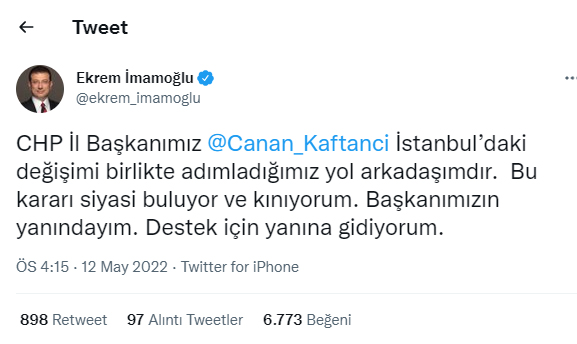 "CHP İl Başkanımız İstanbul’daki değişimi birlikte adımladığımız yol arkadaşımdır.  Bu kararı siyasi buluyor ve kınıyorum. Başkanımızın yanındayım. Destek için yanına gidiyorum."