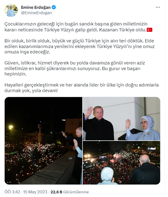 Cumhurbaşkanı ve AK Parti Genel Başkanı Recep Tayyip Erdoğan’ın eşi Emine Erdoğan, ”Çocuklarımızın geleceği için bugün sandık başına giden milletimizin kararı neticesinde Türkiye Yüzyılı galip geldi. Kazanan Türkiye oldu.” değerlendirmesinde bulundu.