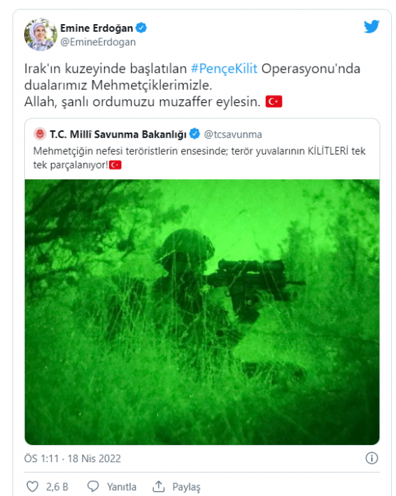 Emine Erdoğan, "Irak'ın kuzeyinde başlatılan Pençe Kilit Operasyonu'nda dualarımız Mehmetçiklerimizle. Allah, şanlı ordumuzu muzaffer eylesin" ifadesine yer verdi.