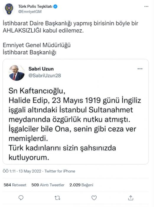 Emniyet Genel Müdürlüğü, Emniyet İstihbarat Dairesi Eski Başkanı Sabri Uzun’un sosyal medya hesabından Yargıtay 3. Ceza Dairesi, CHP İstanbul İl Başkanı Canan Kaftancıoğlu ile ilgili hapis cezasının 4 yıl 11 ay 20 gün olan bölümünün onanmasına ilişkin "Kaftancıoğlu, Halide Edip, 23 Mayıs 1919 günü İngiliz işgali altındaki İstanbul Sultanahmet meydanında özgürlük nutku atmıştı. İşgalciler bile Ona, senin gibi ceza vermemişlerdi. Türk kadınlarını sizin şahsınızda kutluyorum" paylaşımına eleştirili bir yorum getirdi.