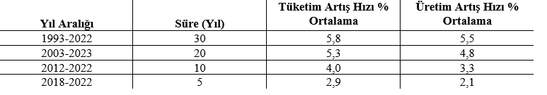 Yukarıdaki tablo, Türkiye elektrik üretim ve tüketim artış eğiliminin dünya ile paralel olarak yüzde 2-3 arasında olduğunu göstermektedir. İlave olarak tabloda yer almayan 2022 yılı 2023 yılı arasında elektrik tüketimi yüzde 0.2, üretimi yüzde 0.6 oranında azalmıştır. Dolayısıyla raporda Sinop NGS yapılmasına gerekçe olarak bahsedilen elektrik tüketiminde hızlı ve yüzde 8 civarındaki artış, gerçeklerle bağdaşmayan; yanıltmaya ve gerekçe yaratmaya yönelik bir savdır.