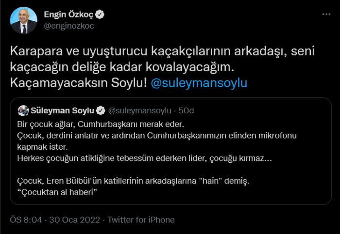 CHP Grup Başkanvekili Engin Özkoç, Süleyman Soylu'nun bu paylaşımını Twitter'dan alıntılayarak tepki gösterdi. Engin Özkoç'un paylaşımı şöyle: