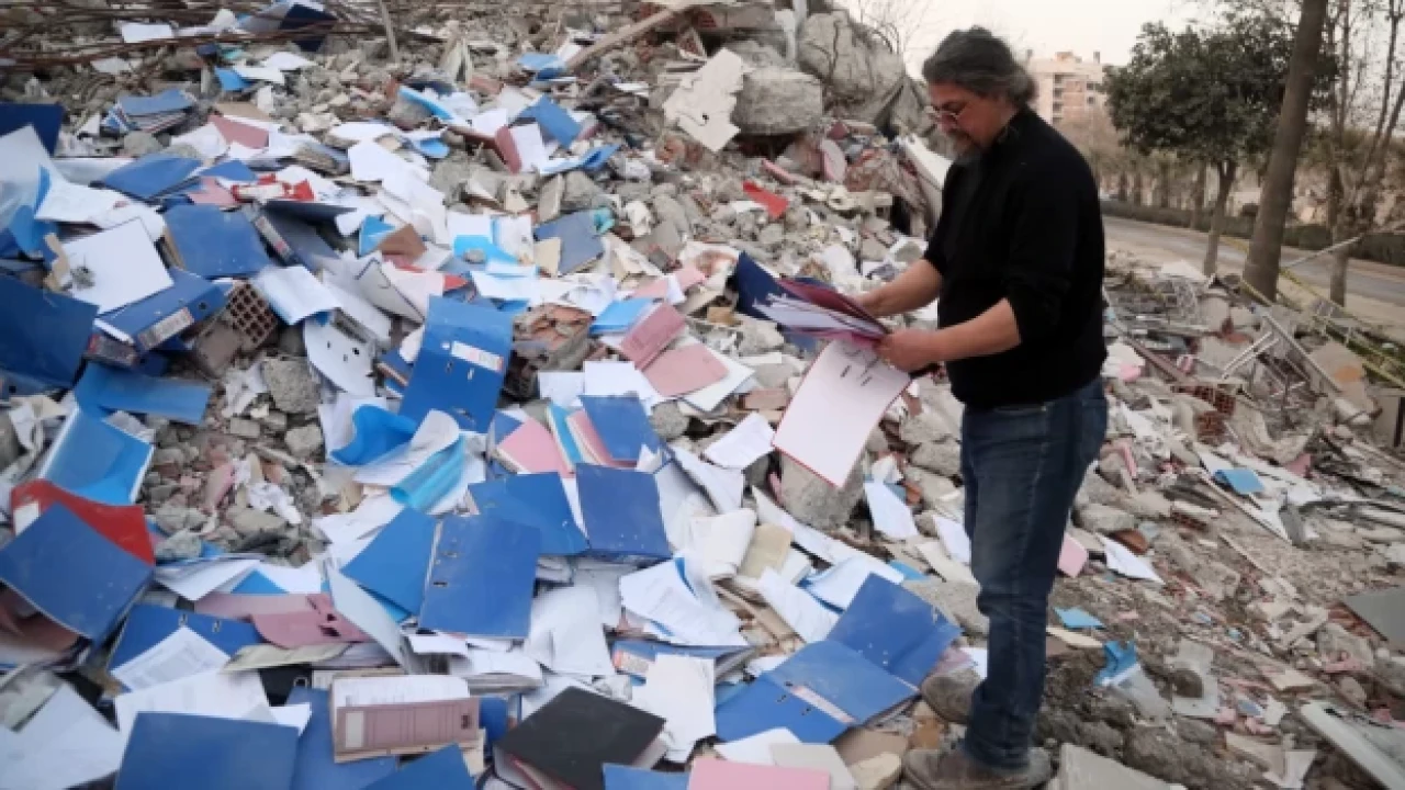 Hatay'da, Çevre, Şehircilik ve İklim Değişikliği İl Müdürlüğü'nün depremde hasar gören hizmet binasının enkazındaki onlarca dosya ve evrak dikkat çekti.