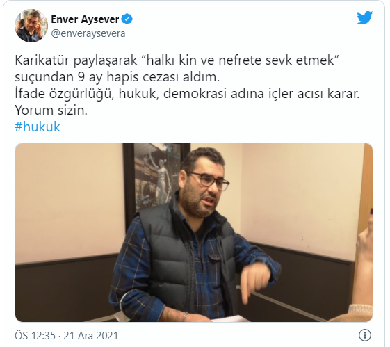 Gazeteci-Yazar Enver Aysever, paylaştığı bir karikatür nedeniyle, "Halkı kin ve nefrete sevk etmek" suçlamasıyla 9 ay hapis cezasına çarptırıldı.