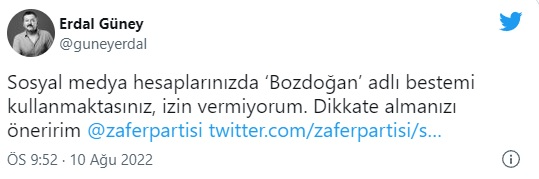 Zafer Partisi, Anafartalar Zaferi kutlaması için hazırladığı videoda izinsiz bir şekilde müzisyen Erdal Güney'in 'Bozdoğan' adlı bestesini kullandı. Duruma tepki gösteren Erdal Güney, "Sosyal medya hesaplarınızda ‘Bozdoğan’ adlı bestemi kullanmaktasınız, izin vermiyorum. Dikkate almanızı öneririm" diyerek Zafer Partisi'ne tepki gösterdi.