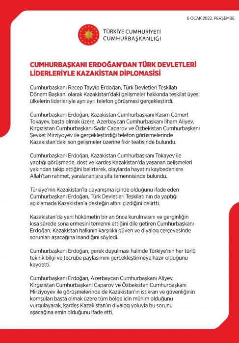Türkiye Cumhuriyeti İletişim Başkanlığından yapılan açıklamaya göre; Cumhurbaşkanı Recep Tayyip Erdoğan, Türk Devletleri Teşkilatı Dönem Başkanı olarak Kazakistan’daki gelişmeler hakkında Kazakistan Cumhurbaşkanı Tokayev ve teşkilat üyesi ülkelerin liderleriyle ayrı ayrı telefonda görüştü.