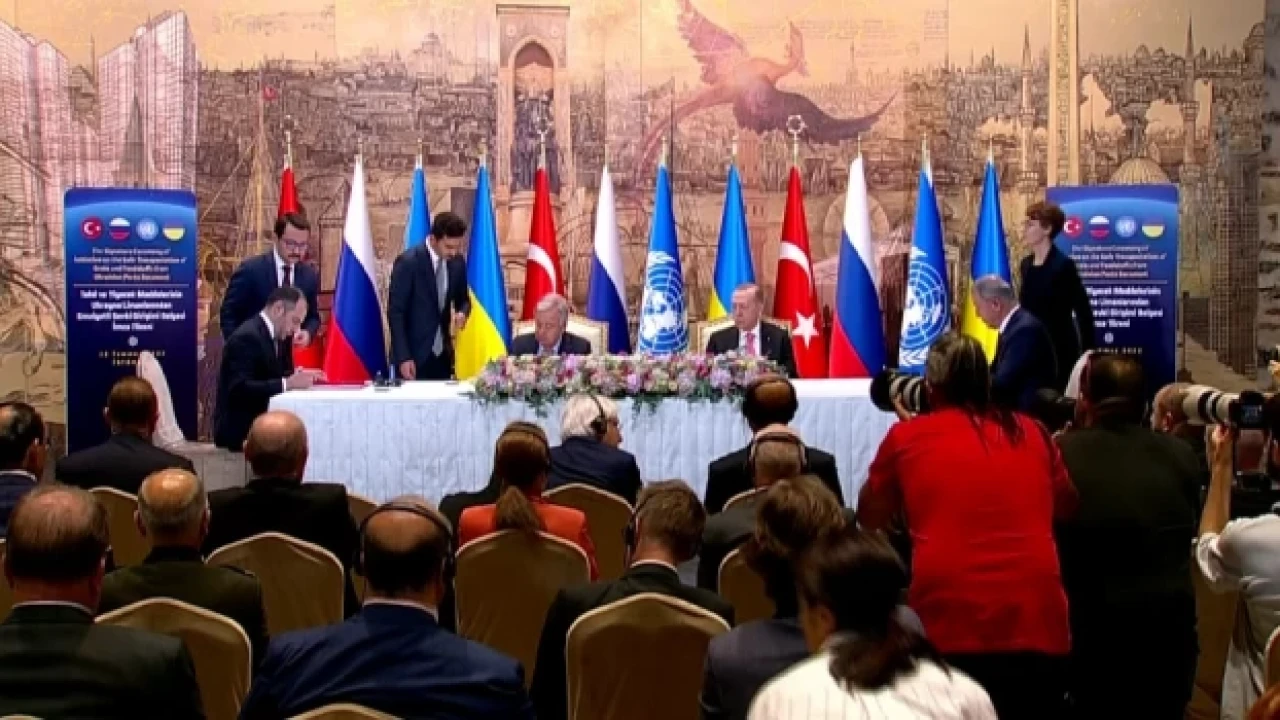 Ukrayna'da Rusya'nın işgali nedeniyle mahsur kalan tahılın çıkarılmasına yönelik varılan anlaşmada imzalar, Cumhurbaşkanı Recep Tayyip Erdoğan ve Birlemiş Milletler (BM) Genel Sekreteri Antonio Guterres’in katılımındaki törenle atıldı. Rusya ve Ukrayna Savunma Bakanları'nın aynı masaya oturmadığı imza töreninde iki defa anlaşma imzalandı.