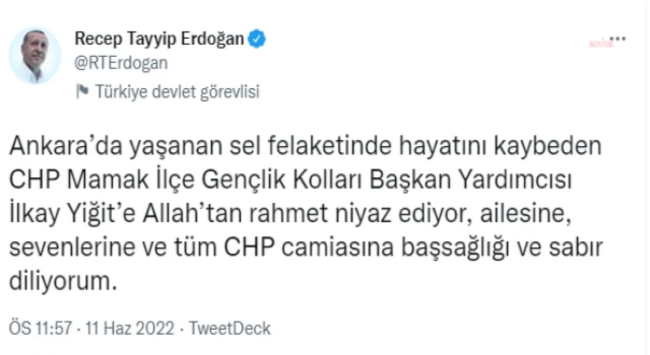 Cumhurbaşkanı Recep Tayyip Erdoğan, “Ankara’da yaşanan sel felaketinde hayatını kaybeden CHP Mamak İlçe Gençlik Kolları Başkan Yardımcısı İlkay Yiğit’e Allah’tan rahmet niyaz ediyor, ailesine, sevenlerine ve tüm CHP camiasına başsağlığı ve sabır diliyorum” mesajını paylaştı.