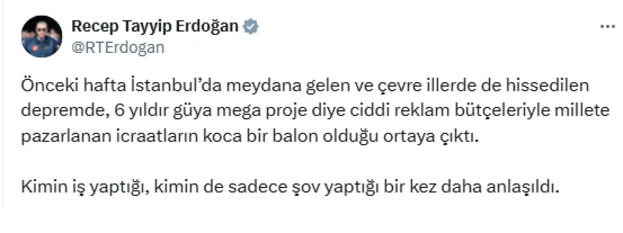 Erdoğan paylaşımında, “Kimin iş yaptığı, kimin de sadece şov yaptığı bir kez daha anlaşıldı” diyerek, halkın yaşadığı afet anlarında gerçeğin ortaya çıktığını söyledi.