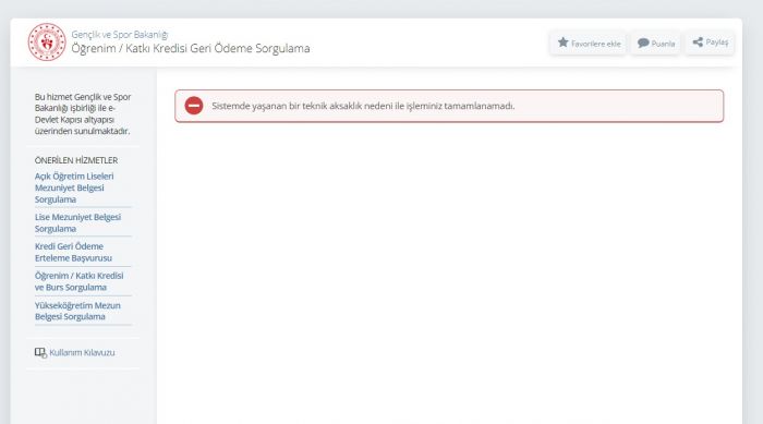Erdoğan’ın, kararı açıklamasının ardından e-Devlet’te bulunan ’Öğrenim/Katkı Kredisi Geri Ödeme Sorgulama’ sekmesi üzerinden işlem yapılamadı.