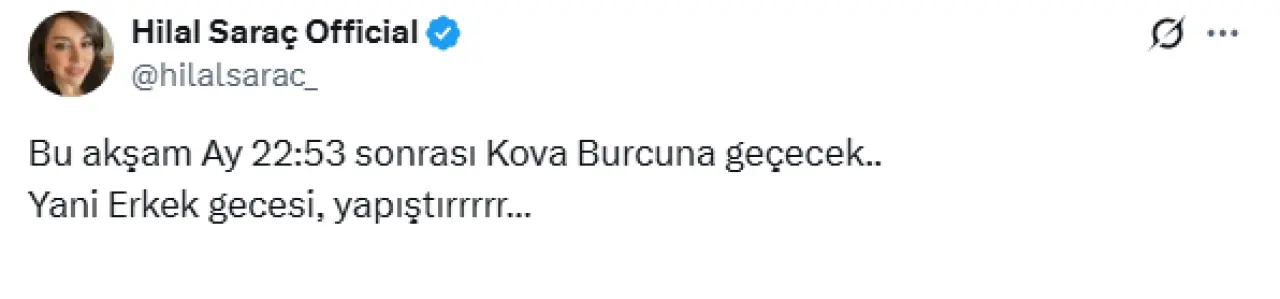 Astrolog Hilal Saraç’ın “Ay bu akşam Kova’ya geçiyor — yani erkek gecesi” paylaşımı sonrası oyuncu/yorumcu Nihan Urel sert tepki verdi. İki isim arasındaki atışma sosyal medyada gündem oldu.