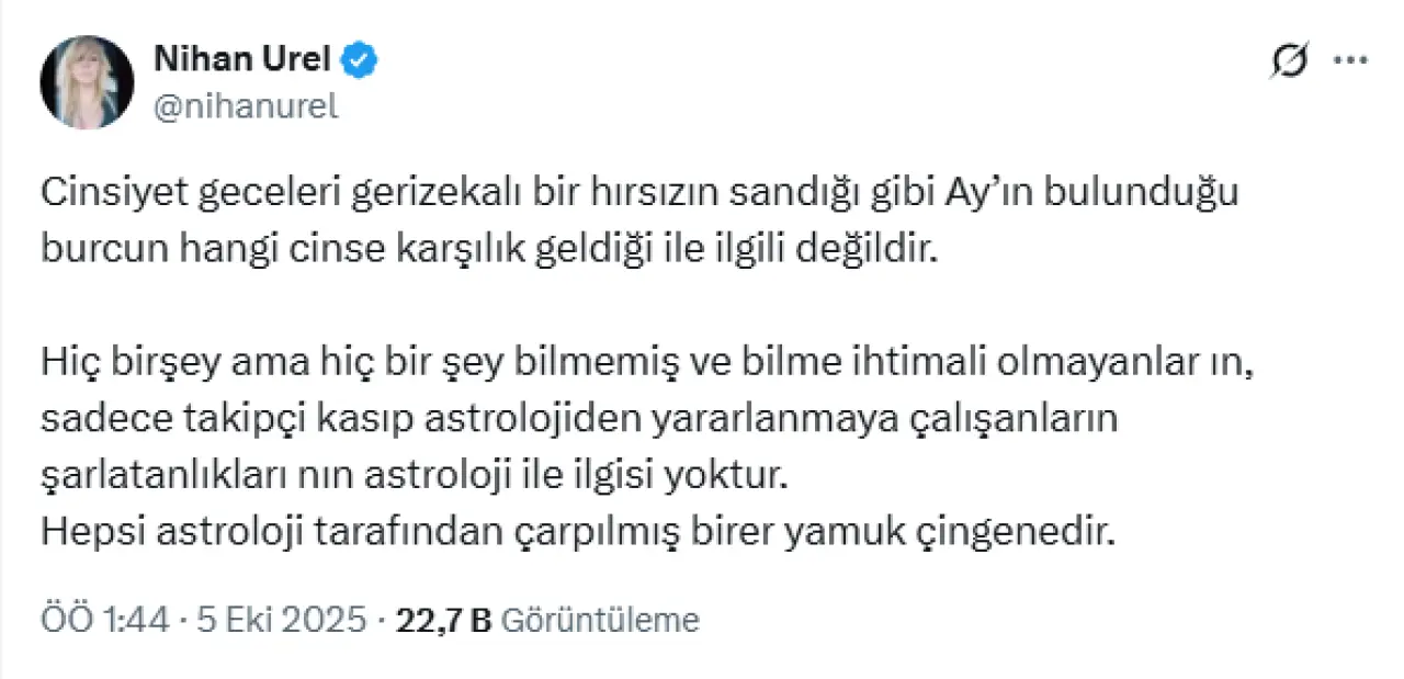 Saraç’ın paylaşımına yanıt veren Nihan Urel, “Cinsiyet geceleri gerizekalı bir hırsızın sandığı gibi Ay’ın bulunduğu burcun hangi cinse karşılık geldiği ile ilgili değildir. Hiçbir şey bilmemiş ve bilme ihtimali olmayanların, sadece takipçi kasıp astrolojiden yararlanmaya çalışanların şarlatanlıkları astroloji ile ilgisi yoktur” diyerek astroloji üzerinden takipçi toplama yöntemlerini eleştirdi.