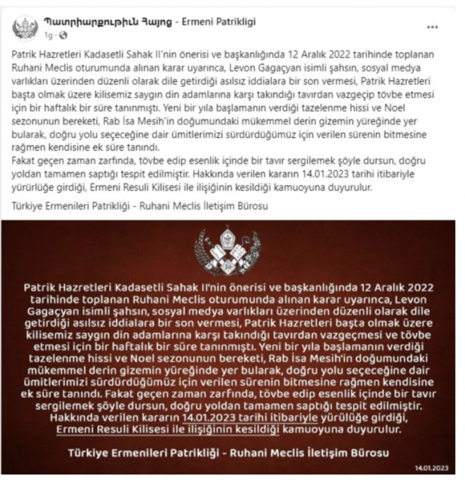 “Levon Gagaçyan isimli şahsın, sosyal medya varlıkları üzerinden düzenli olarak dile getirdiği asılsız iddialara bir son vermesi, Patrik Hazretleri başta olmak üzere kilisemiz saygın din adamlarına karşı takındığı tavırdan vazgeçmesi ve tövbe etmesi için bir haftalık süre tanınmıştı. Yeni bir yıla başlamanın verdiği tazelenme hissi ve Noel sezonunun bereketi, Rab İsa Mesih’in doğumundaki mükemmel derin gizemin yüreğinde yer bularak, doğru yolu seçeceğine dair ümitlerimizi sürdürdüğümüz için verilen sürenin bitmesine rağmen kendisine ek süre tanındı. Ama geçen zaman zarfında, tövbe edip esenlik içinde bir tavır sergilemek şöyle dursun, doğru yoldan tamamen saptığı saptandı. 14 Ocak itibarıyla Ermeni Resuli Kilisesi ile ilişiğinin kesildiği kamuoyuna duyurulur.”