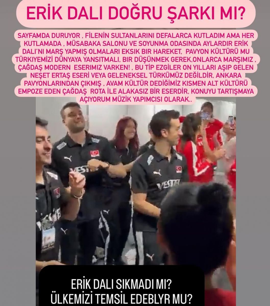Bu başarının ardından Erol Köse'nin sosyal medya hesabından yapmış olduğu paylaşım dikkat çekti. Erik Dalı ile kutlama yapan Filenin Sultanları'nı eleştiren Köse, “Pavyon kültürü mü Türkiye'mizi dünyaya yansıtmalı, bir düşünmek gerek onlarca marşımız, çağdaş modern eserimiz varken! Bu tip ezgiler on yılları aşıp gelen Neşet Ertaş eseri veya geleneksel türkümüz değildir. Ankara pavyonlarından çıkmış, avam kültür dediğimiz, kısmen alt külürü empoze eden, Çağdaş rota ile alakasız bir eserdir.” ifadelerini kullanarak, müzik yapımcısı olarak konuyu tartışmaya açtığını söyledi.