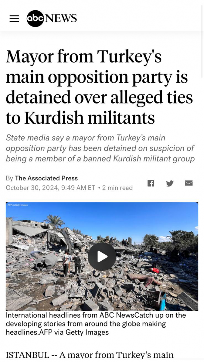 Ünlü medya kuruluşu “Türkiye'de ana muhalefet partisinden bir belediye başkanı Kürt militanlarla bağlantılı olduğu iddiasıyla gözaltına alındı” başlığını kullandı.