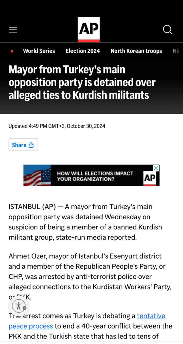 “Türkiye'de ana muhalefet partisinden bir belediye başkanı Kürt militanlarla bağlantılı olduğu iddiasıyla gözaltına alındı”