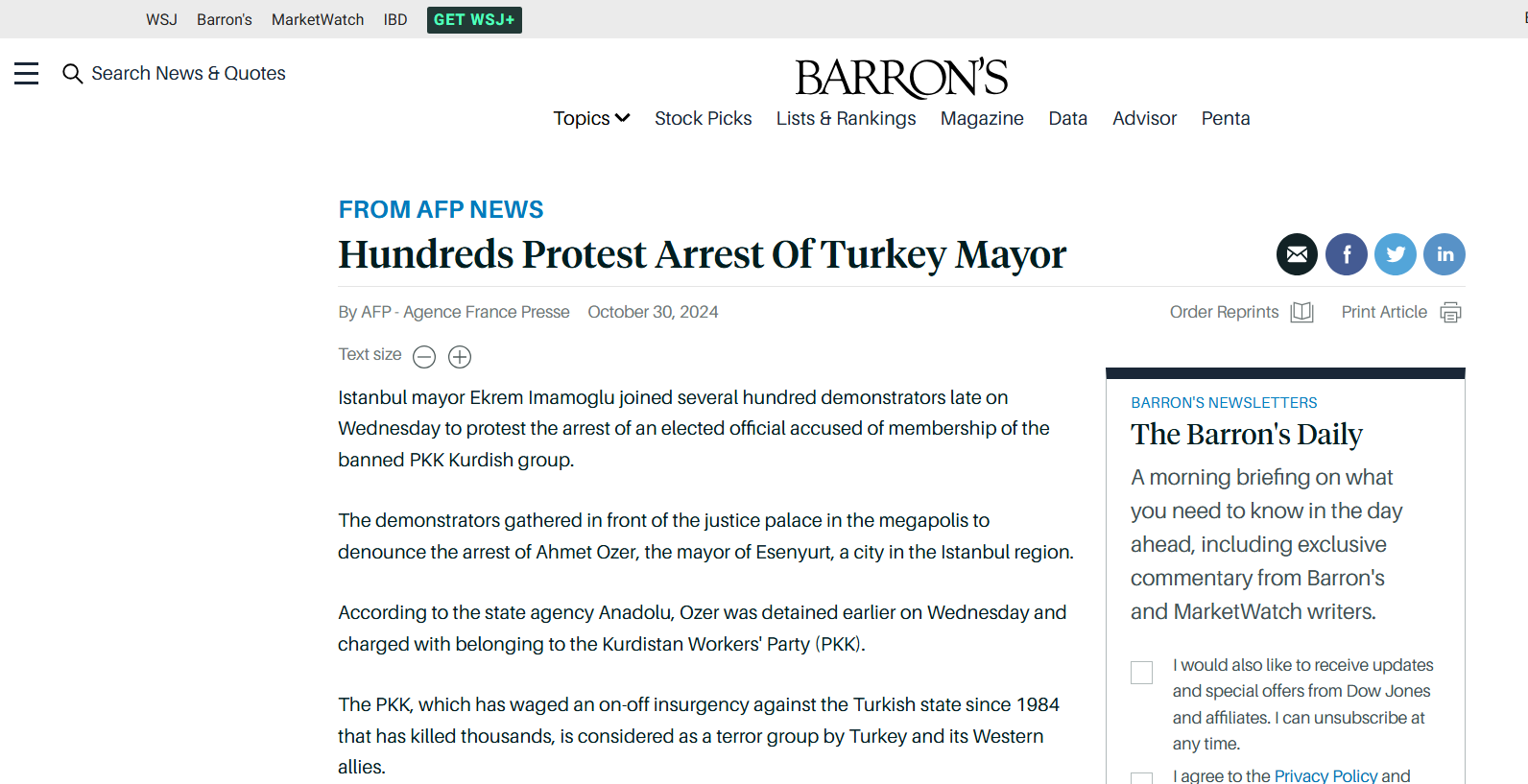 Barron’s ise ‘Yüzlerce kişi Türkiye’de belediye başkanının tutuklanmasını protesto etti’ diyerek yaşanan olayın halktaki yansımasını başlığına taşıdı.