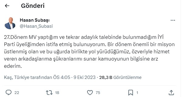 Subaşı, sosyal medya hesabından yaptığı açıklamada, "27.Dönem MV yaptığım ve tekrar adaylık talebinde bulunmadığım İYİ Parti üyeliğimden istifa etmiş bulunuyorum" dedi.