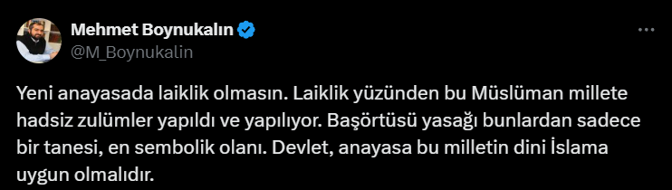 Son paylaşımında, "1921 ve 1924 anayasalarında devletin dini İslam'dı ve laiklik yoktu. Cumhuriyet fabrika ayarlarına dönsün," diyerek, Türkiye'nin kuruluş dönemine atıfta bulundu. Boynukalın, "Başörtüsü yasağı gibi zulümler, laiklik yüzünden yaşandı. Anayasa, bu milletin dini İslam'a uygun olmalıdır," şeklinde konuştu.