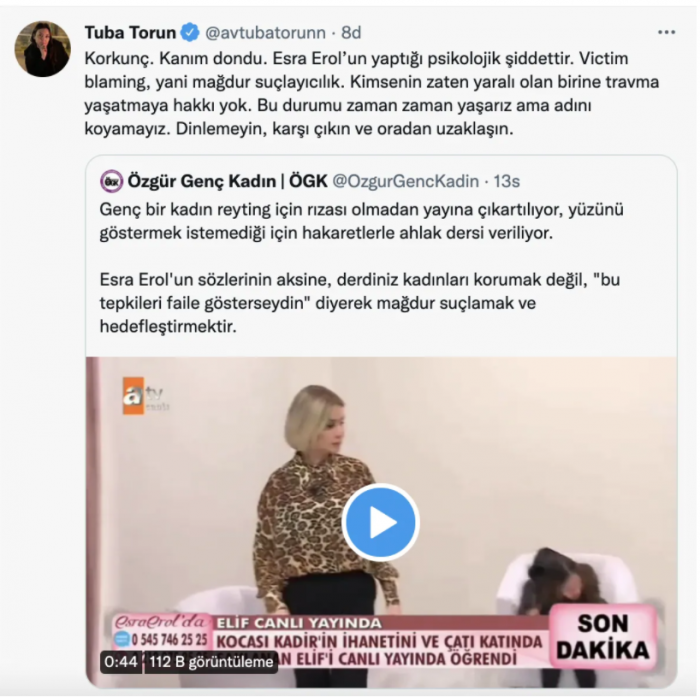 “Kameraların önünde suratına suratına bağırarak o küçücük kıza söylediklerinin, öldürülen, şiddete uğrayan kadınlara ‘Orada ne işi varmış?’ demekten ne farkı var? Sen kimsin de yayına çıkmak istemeyen, belli ki ağır travma yaşayan bir kadın üzerinden şov yapıyorsun?”