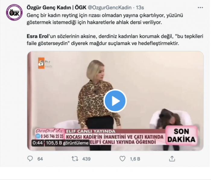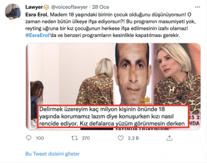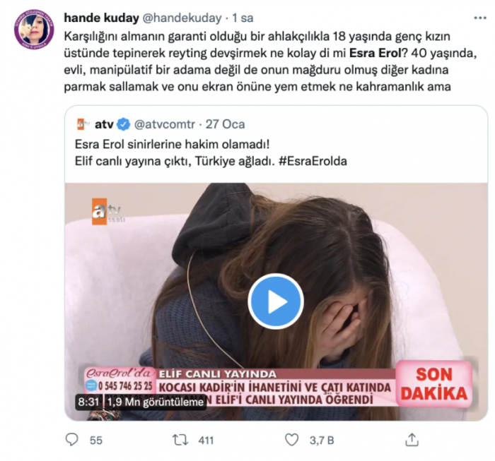 ATV'de Esra Erol'un ekranda yüzünün gözükmesini istemeyen 18 yaşındaki genç kızı azarlaması ve ifşa etmesi sosyal medyada tepkilere neden oldu. Erol'un genç kıza bağırdığı anlar ATV’nin sosyal medya hesabında “Esra Erol sinirlerine hakim olamadı! Elif canlı yayına çıktı, Türkiye ağladı” ifadesiyle paylaşıldı. Genç kadının yüzünün gözükmesini istemediği video, milyonlarca kere görüntülendi.