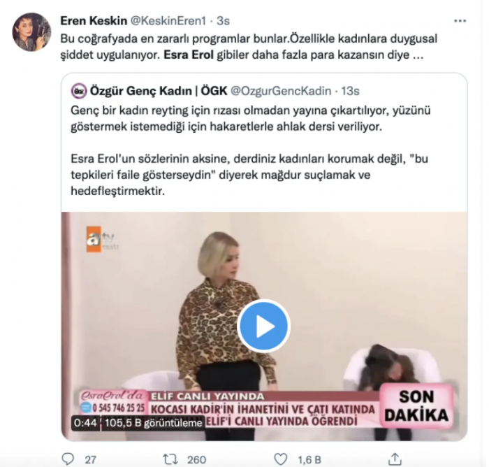 Galatasaray Üniversitesi İletişim Fakültesi öğretim üyelerinden Doç. Dr. Ceren Sözeri, "Umarım Elif, Esra Erol'a dava açar" dedi. Avukat Eren Keskin "Bu coğrafyada en zararlı programlar bunlar. Özellikle kadınlara duygusal şiddet uygulanıyor. Esra Erol gibiler daha fazla para kazansın diye..." ifadesini kullandı. Avukat Tuba Torun ise tepkisini "Korkunç. Kanım dondu. Esra Erol’un yaptığı psikolojik şiddettir. Victim blaming, yani mağdur suçlayıcılık. Kimsenin zaten yaralı olan birine travma yaşatmaya hakkı yok. Bu durumu zaman zaman yaşarız ama adını koyamayız. Dinlemeyin, karşı çıkın ve oradan uzaklaşın." sözleriyle ifade etti.