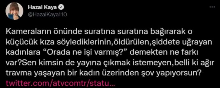 Yaşananlara sessiz kalmayanlardan biri de ünlü oyuncu Hazal Kaya oldu. Kaya, Twitter’dan yaptığı paylaşım ile Esra Erol’un sözlerine ve yayında yaşananlara çok sert tepki gösterdi.