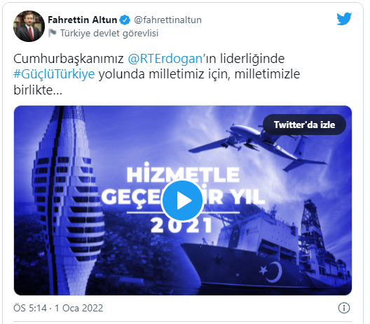 İletişim Başkanı Fahrettin Altun, sosyal medya hesabından, Cumhurbaşkanı Recep Tayyip Erdoğan'ın 118 paylaşımla aktardığı 2021 yılı icraat ve faaliyetlerine ilişkin İletişim Başkanlığı tarafından hazırlanan videoyu paylaştı.