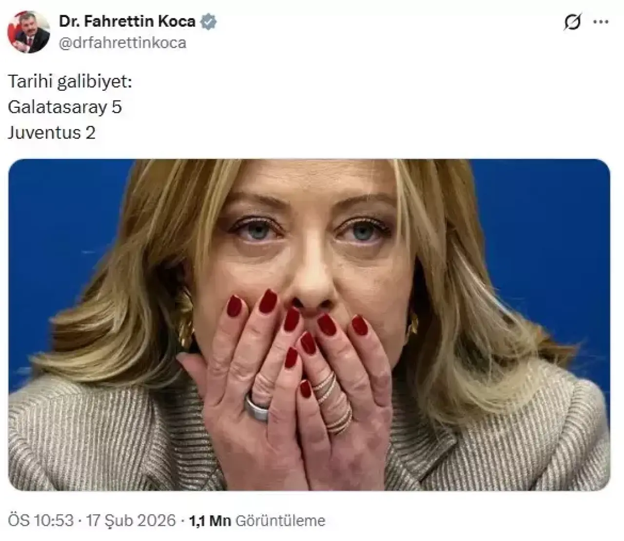 Galatasaray’ın Juventus’u 5-2 mağlup etmesinin ardından eski Sağlık Bakanı Fahrettin Koca, İtalya Başbakanı Giorgia Meloni üzerinden yaptığı esprili paylaşımla sosyal medyada gündem oldu.