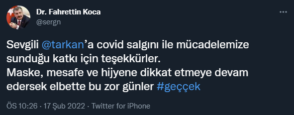 Sevgili @tarkan’a covid salgını ile mücadelemize sunduğu katkı için teşekkürler. Maske, mesafe ve hijyene dikkat etmeye devam edersek elbette bu zor günler #geççek