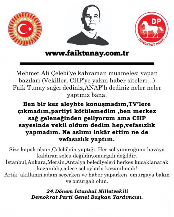 Demokrat Parti Genel Başkan Yardımcısı Faik Tunay sosyal medya hesabı üzerinden Mehmet Ali Çelebi'ye ve CHP'ye yakın haber sitelerine eleştiride bulundu: