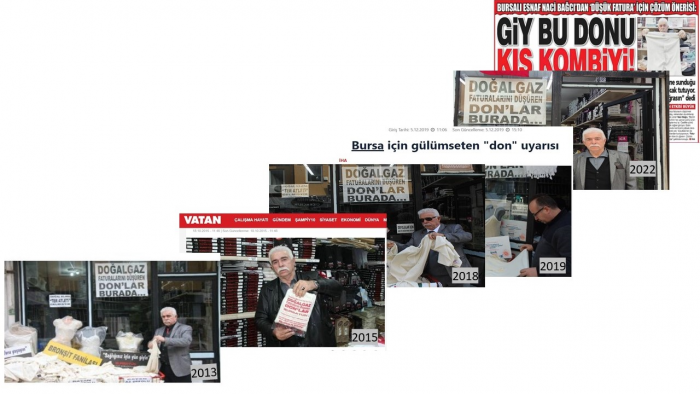 Bursalı uyanık esnafla ilgili ilk haberi 2013 yılında buldum. İHA ve Mynet internet sitelerinde “Doğalgaz faturalarını düşüren donlar” başlığıyla 26 Aralık’ta yayımlanan haberde Naci Bağcı’nın dükkanının önünde çekilmiş fotoğrafı yer alıyordu. Camda yine aynı yazı asılıydı.