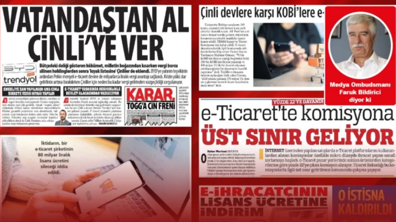 E-Ticaret yasası değiştirilerek, bir şirketin lisans bedelinde milyarlarca liralık indirim yapılmak istenmesinin haber değeri tartışılmaz. Üstelik de Karar gazetesi, günler önce bu değişikliğin Trendyol için yapıldığını İbrahim Kahveci imzasıyla “Vatandaştan al Çinliye ver” diye manşetten duyurmuşken.