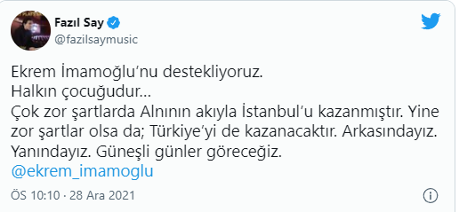 Fazıl Say, Twitter hesabından İstanbul Büyükşehir Belediyesi (İBB) Başkanı İmamoğlu'na destek paylaşımı yaptı.