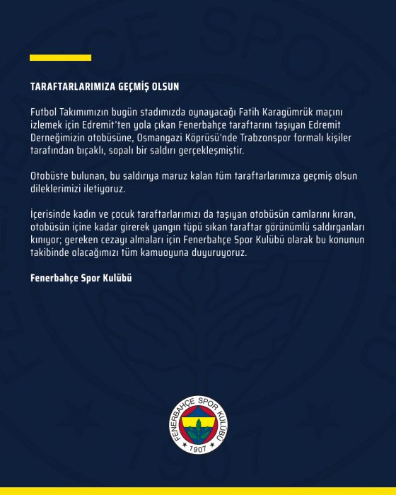 “Futbol Takımımızın bugün stadımızda oynayacağı Fatih Karagümrük maçını izlemek için Edremit'ten yola çıkan Fenerbahçe taraftarını taşıyan Edremit Derneğimizin otobüsüne, Osmangazi Köprüsü'nde Trabzonspor formalı kişiler tarafından bıçaklı, sopalı bir saldırı gerçekleşmiştir. Otobüste bulunan, bu saldırıya maruz kalan tüm taraftarlarımıza geçmiş olsun dileklerimizi iletiyoruz.