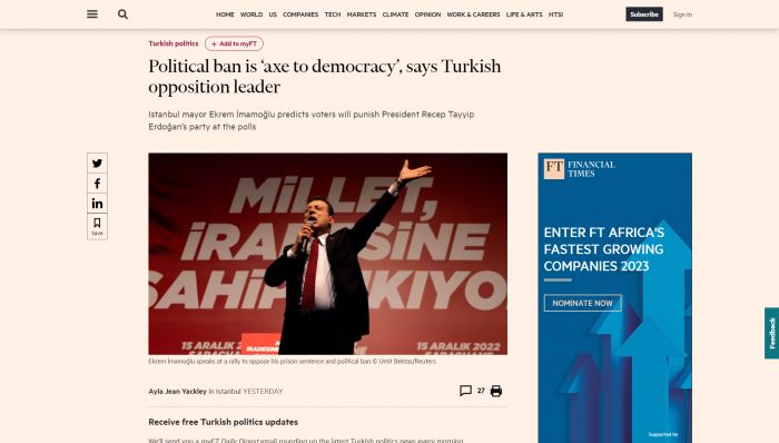 Yüksek Seçim Kurulu (YSK) üyelerine hakaret ettiği iddiasıyla hakkında 2 yıl 7 ay hapis cezası ile siyasi yasak kararı verilen İstanbul Büyükşehir Belediye (İBB) Başkanı Ekrem İmamoğlu, seçime ve söz konusu kararlara ilişkin Financial Time'a konuştu.