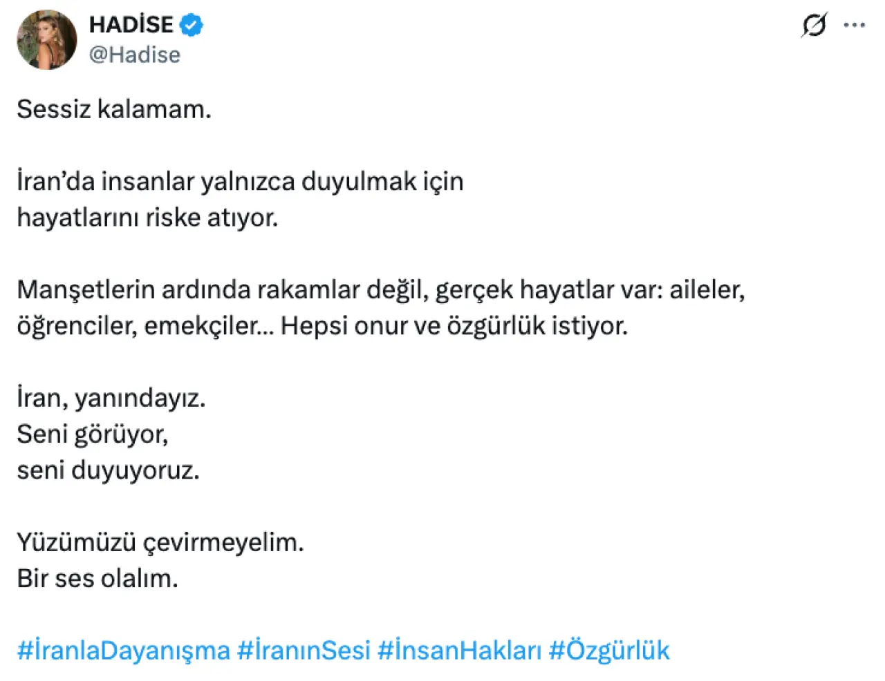 Hadise, sosyal medya hesabından yaptığı paylaşımda İran’da yaşananlara dikkat çekerek, insanların yalnızca duyulmak için hayatlarını riske attığını vurguladı. Paylaşımında, yaşananların yalnızca rakamlardan ibaret olmadığını belirten Hadise, İran halkına destek mesajı verdi.