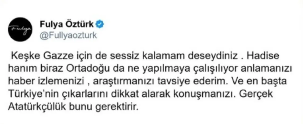 Bu paylaşımın ardından Fulya Öztürk, Hadise’ye tepki göstererek, Gazze konusunda da aynı hassasiyetin gösterilmesi gerektiğini ifade etti. Öztürk, Ortadoğu’da yaşanan gelişmelerin daha geniş bir perspektiften değerlendirilmesi gerektiğini savundu.