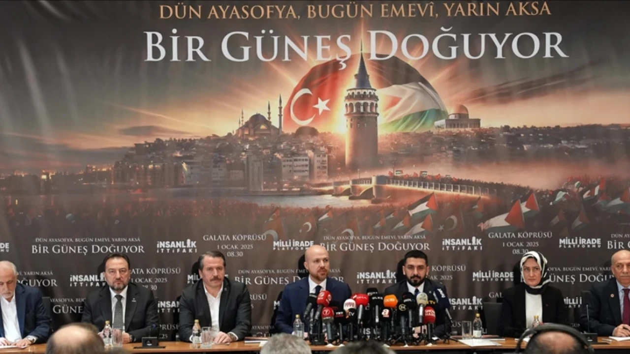 Türkiye'deki 308 Sivil Toplum Kuruluşunun (STK) bir araya gelerek oluşturduğu Milli İrade Platformu üyeleri, Eyüpsultan'daki Türkiye Gençlik Vakfı (TÜGVA) Genel Merkezi'nde basın toplantısı düzenledi. Platform üyeleri, "Dünyayı Uyandırıyoruz", "Dün Ayasofya, bugün Emevi, yarın Aksa" ve "Bir Güneş Doğuyor" sloganlarıyla 1 Ocak'ta Galata Köprüsü'nde düzenlenecek eyleme katılım için ortak çağrıda bulundu.