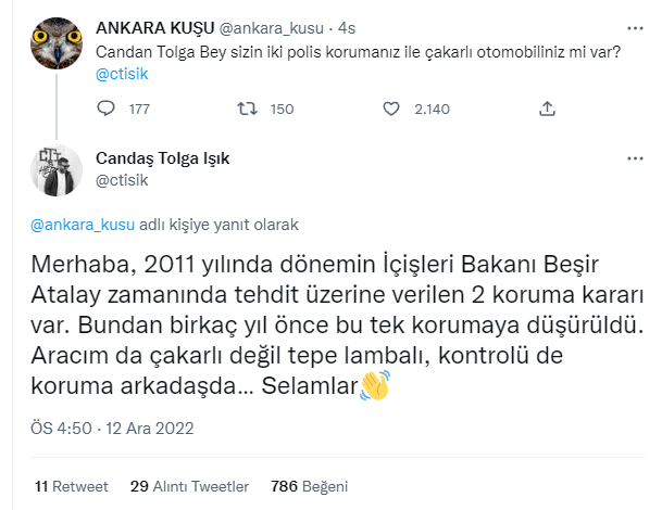 "Ankara_kusu" adlı Twitter hesabı'nın sorusu "Candan Tolga Bey sizin iki polis korumanız ile çakarlı otomobiliniz mi var?" şeklinde oluyor.
