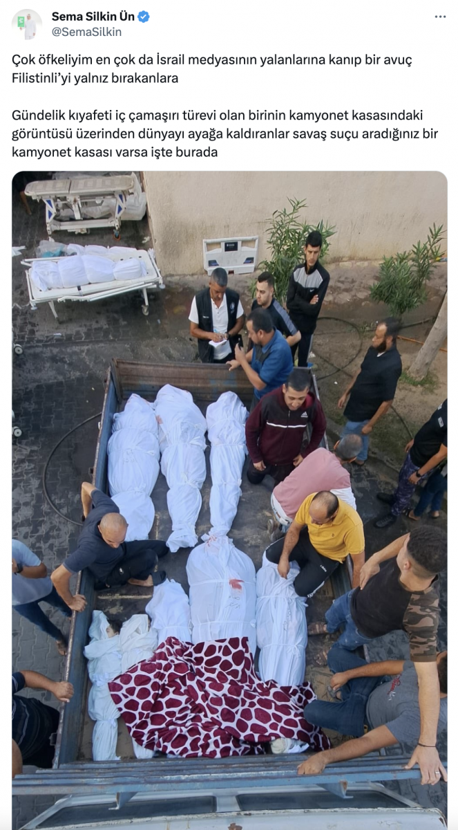 İsrail-Filistin arasındaki çatışmalara ilişkin Gelecek Partili Sema Silkin Ün tepki çeken bir gönderi paylaştı. Ün, paylaşımında Hamas militanları tarafından kaçırılan Shani Louk'un giyimi üzerinden acı kıyaslaması yaptı. Ün, Louk’un iç çamaşırlarına kadar soyulmasına işaret ettiği paylaşımında, bir kamyonet kasasındaki kefene sarılmış cansız bedenler üzerinden sitemde bulundu.