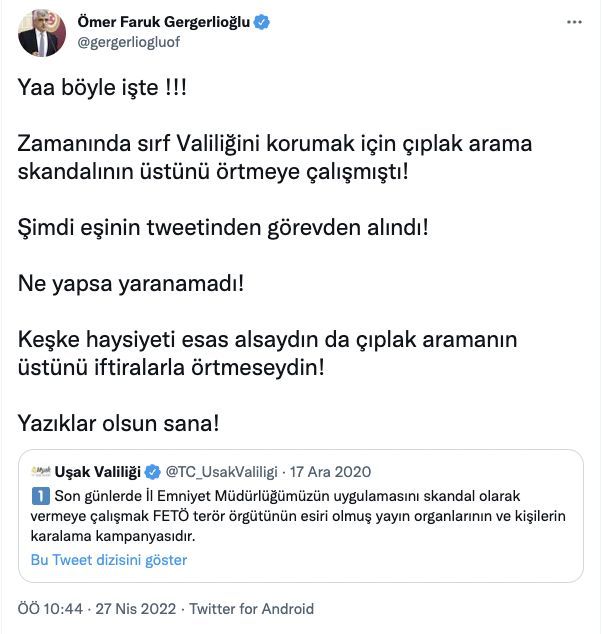 "Ya böyle işte! Zamanında sırf valiliğini korumak için çıplak arama skandalının üstünü örtmeye çalışmıştı. Şimdi eşinin tweetinden görevden alındı. Ne yapsa yaranamadı. Keşke haysiyeti esas alsaydın da çıplak aramanın üstünü iftiralarla örtmeseydin. Yazıklar olsun sana"