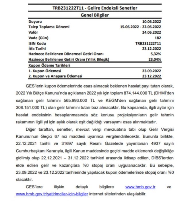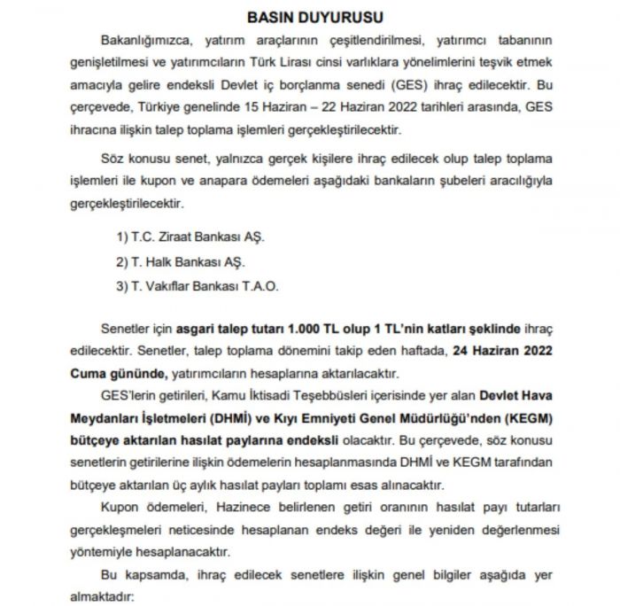 "Bakanlığımızca, yatırım araçlarının çeşitlendirilmesi, yatırımcı tabanının genişletilmesi ve yatırımcıların Türk Lirası cinsi varlıklara yönelimlerini teşvik etmek amacıyla gelire endeksli Devlet iç borçlanma senedi (GES) ihraç edilecektir. Bu çerçevede, Türkiye genelinde 15 Haziran – 22 Haziran 2022 tarihleri arasında, GES ihracına ilişkin talep toplama işlemleri gerçekleştirilecektir.
