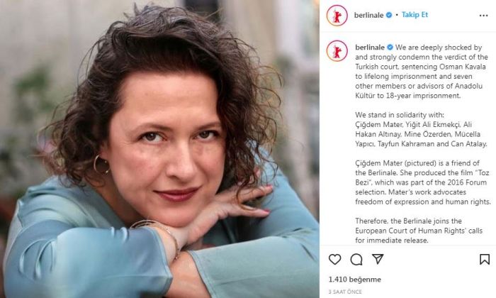 "Türk mahkemesinin Osman Kavala'yı ömür boyu ve Anadolu Kültür'ün diğer yedi üyesi veya danışmanına 18 yıl hapis cezasına çarptırdığı kararı bizi derinden sarstı. Bu kararı şiddetle kınıyoruz. Berlinale olarak, Çiğdem Mater, Yiğit Ali Berlinale'den yapılan açıklamada, "Türk mahkemesinin kararını şiddetle kınıyoruz" denildi. Açıklamada ayrıca tutuklanan sinemacı Çiğdem Mater hakkında "Berlinale'nin dostudur" yorumu yer aldı.